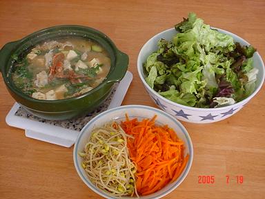 今日は気温が30℃だったわりに、気持ちのいい風が吹いて、エアコンなしで家中の窓を開けて、心地よく過ごせた一日。息子が夏休みで朝早く起きる必要性がなくなってしまった今、私の堕落した生活が始まっている。先週いっぱいまでは、旦那が休みを取っていたから、子供の朝ごはんのことは旦那がやってくれるにしろ(やってもらってるのかぁ?って感じだけど)、昼ごはんは旦那の分までしっかり作らなきゃいけなかったから、自然に気合が入ったけど、旦那が通常通り、仕事に行き始めると、もうダラダラ生活である。。。子供の朝ごはんは、シリアルとか、パン、ご飯と前日の夕飯の残り物とか、超適当。昼ごはんは、うどん、そうめん、そば、パスタなど、これも超適当。夕飯だけは気合を入れるって感じ。。。。あぁ。。悪妻悪母である。そんな堕落した生活。でも、お菓子やパンを作るときだけは、どんなときも気合が入る!今日の子供のおやつはアーモンドビスコッティーである。なんか、最近はフリーページの「お菓子部屋」に追加していけるような新しいお菓子は作っていないなぁ。。。どうしても夏は暑いから、クリームを使うお菓子や、ムース系のお菓子は、うまく固まらなかったり、氷水に当てて泡立ててもクリームがちゃんと泡立たなかったり。。。で、作る気にならないから、どうしても見た目地味系で、かつ簡単なお菓子になってしまう。パンなんて、夏は絶好の季節! 発酵も簡単だしね。ビスコッティーのレシピにも色々あるけど、(前にも書いたなぁ。。)私は製菓学校の基礎コースの時のクラスメートからもらったレシピを自分なりにアレンジしたものを好んで使っている。色々とビスコッティーのレシピを探してみたけど、ほとんどがマーガリンやバターを使っている。(ノーファットのものもあったけど。。。)私愛用のレシピはキャノーラ油を使う。バターは動物性脂肪で、あまり体によくないし、マーガリンはモノによっては水添油脂だし、他にもフレーバーに多くの添加物を使っていたりするし。パンを作るときは、水添油脂を使っていないマーガリンを使うけど。。。それらに比べたら、同じ「油」でもキャノーラ油は体に優しい。その証拠か、ビスコッティーの生地を作ったボールやヘラを洗うとき、油っぽさが手に全く残らない。バターやマーガリンを使った器具を洗うと、洗剤をつけて、さらにお湯で手を洗わないと、なんかまだベトベト感が残るのに。。。(私の気のせいかな?)さて、子供たちは、オーブンに入れる前から「クッキー、クッキー!」と、うるさい。ビスコッティーが出来上がると、子供たちはパクパクと食べ、娘は昼寝に入ってしまった。息子は2階でベッドに横になってアンパンマンのビデオを見ていた。「うーん、多分、寝ちゃうんだろうなぁ。。私もちょっと横になろうかな」と娘の隣にゴロリと横になったら、気が付いたらあっという間に30分ほど夢の中に引き込まれていた。気が付くと、「今日の料理」が始まっていた。今日は「栗原はるみの夏の香りスシ」。うーん。。。なかなかいけるかも。。。。と思い、今週のいつか、買い物に行って、材料を買ってきて作ってみよう!と心に決めた。今日の料理も終わり、やっと重い腰を上げ、冷蔵庫を開けて「さぁ、今夜の夕飯は何にしようかなぁ。。。」と物色。冷凍庫を開けると、土曜日に中国系スーパーで買った、渡りガニがあった!「そうだ、今日はケジャングック(ガニの味噌汁)にしようか、って言ってたんだっけか。。。」この真夏に(真夏だから?)中国系スーパーに行くと、生きた渡りガニが売られている。でも、生きたカニは処理が大変だから、すでに甲羅が取ってあって、パックに入っているカニを買って来た。これが冬なら、処理が大変でも生きたカニを買って、ケジャン(カニのからし味噌漬け)を作るところ。が、やっぱり真夏だからねぇ。。。ケジャンを作っても、あたったら怖いし。。。そんなんで、ケジャングックを作った。 きっと旦那は「コッケメウンタン(渡りガニの辛スープ)がいいに決まっている!でも、子供たちも食べられるように、ケジャングックで我慢してもらう。その他に、豆もやしのナムル、ニンジンのナムル、そして出がらし昆布ドレッシングのサラダ。最近「出がらし昆布ドレッシング」に凝っている。これは、NHKの「ためしてガッテン」で出がらし昆布の活用法を見てから、だまされたと思って作ってみたらおいしかったから、私流に「出がらし昆布ドレッシング」を作ってしまった。経済的かつ健康的、それでおいしかったら万々歳!さて、夕飯の後、旦那は表に出て、ドライブウェイから玄関先までの通路をまじまじとみて、インターロッキングをどうしようかと考えていた。通路の脇は今、花壇になっているんだけど、雨が当たらないところはどうしても育ちが悪いし、もともと土が浅く、苗を植えても、貧弱なお花にしかならなくて、ずっと空っぽのまま。その部分