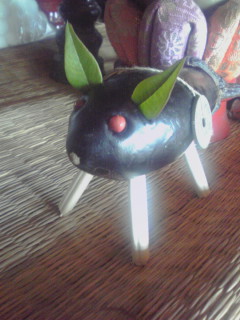 こちら、7月がお盆なので、昨日はお盆の仕度をしました。子供が3人生まれて一段落ついた頃から、お盆などの、地方(我が家)の「しきたり」っぽいことを、母から教えてもらってきましたが、こんなに早く母が逝くとは思ってなかったので(7年前に亡くなったので)、もっとしっかり聞いておけば良かった・・と、今になって思います。初盆の時は大変だったけど、今は普通にお盆を迎える仕度だけなので、仏壇を「お盆バージョン」に飾り、キュウリやナスで、馬や牛を作ります。見たことありますか? こんな感じ。 初盆のときは、キュウリの馬と、ナスの牛の両方を作るんです。普通のお盆のときは、ナスで牛を作るだけなんだけど、私はこれがすごく下手くそで、バランスの悪いヘンテコな牛になっちゃうんですわ(;´Д`)私、絵を書くことは好きだけど、立体的になると、どうもダメで・・・( ̄▽ ̄;)しかし、これ、桃がすごく巧いの!というのは、私がかえでのことで、ずっとてんてこ舞いだったもんだから、桃はおばあちゃんと過ごすことが多くて、小さい頃からおばあちゃん子でした。なので、お盆の仕度も、おばあちゃんと一緒にやっていて、覚えているんです。私が知らないことも、おばあちゃんから聞いて知っていて、逆に、私が桃に教えてもらったり・・・「母から子へ」ではなく、「子から母へ」になっているという感じ(笑)で、母が亡くなってから、このナスの牛は、桃が担当です( ´艸`)昨日も、夕方に帰宅した桃を待ちうけて、作ってもらいました。他のことを頼んだなら、すぐに不機嫌になるところだけど、「疲れた~」を連発しながらも、自分の仕事だとわかっているので、「しょうがないな、作ってやるよ^^」と言って、ちょちょいのちょいと仕上げてくれました(*´∇`*) 耳は南天の葉、目は小豆で作ります^^上の絵と向きが反対だけど、こうやって教わったので、これが我が家流(o^-')b一緒にそばで見ていた林檎は、「ご先祖様が早く帰ってこれるように、 来る時はキュウリの馬に乗ってやってきて、 帰りは、ナスの牛でゆっくり帰るんだって」と、お盆のうんちくを述べています。(↑口ばっかりで手伝わない人)夜はたいまつを焚いて、ご先祖様を迎えます。おじいちゃんと桃とかえでの3人で、花火も一緒にやっていましたその後、桃がピアノの練習をしていて、ちょっと物悲しいようなメロディだったせいか、いろんな想いがこみ上げてきて・・・というか、主には母のことだったんだけど、なんか、母のことを思い出して、久々に泣けてきてしまいましたm(u_u)m子供たちも大きくなったよ。みんな元気に頑張ってるよ。私、最近調子悪いんだ・・・でも長生きしたいから、あんまり早く迎えに来ないでよ・・・お盆のときは、のんびりしてもいいってことになっています。今日は午前中、洗濯と掃除をがんがんやって、すごくすっきりしたので、午後はPCで遊ばせてもらいました~( ´ ▽ ` )ノ