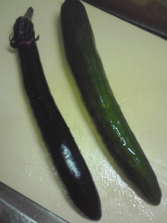 家のすぐ前に畑があります。100mくらい歩いたところにも、うちの畑があります。近い畑には、すぐに採って食べられる野菜を作っていて、遠い畑には、ジャガイモ、サトイモ、サツマイモ、タマネギ、豆類など、収穫して置いておけるものを作っています。(って、おじいちゃんが作ってるんだけど^_^;)今の旬といったら、やっぱりキュウリ、ナス、トマト・・でしょう。毎日どんどん大きくなるので、もう食べきれないんですよ。ご近所にお裾分け・・・と言っても、周りの家も、み~んな作っているし(;´д`)トホホそんなわけで、毎年のことながら、いろいろ消費する方法を考えています。おとといから、ぬか漬けを始めました。亡くなった母のおススメだった「百年床」という乾燥したぬか床なんだけど、これがけっこういい感じでできるんですよ^^JAのお店で売っているので、良かったら試してみてね(o^-')b今日は、キュウリみたいなナスを見つけました( ̄▽ ̄;) これは丸ごと、ぬか床行きです。 ほかの普通サイズのナスは、素揚げして、めんつゆをドボドボかけて、揚げびたしに。 先日の現場実習のときの写真にもあったように、かえでは、自分で指や脇などに何かを挟んで圧迫させていることがあります。こうして、自分で落ち着かせているんだけど、脇に挟むのは、すごく小さなものだったりします。小さな糸くずを丸めたものの時もあるし、何もないと、着ている洋服の脇の辺りをたぐり寄せているときもあります。今日の夕食の時、かえでがまた脇に何かを挟んで締めているので、「なに挟んでるの?」と聞くと、「おわりっ!」と言って、見せたくないようでした。見せたくないとなると、どうしても見たくなります。「いいじゃん、見せてやあ」と、しつこく言うと、しぶしぶ脇から出したものは・・・キュウリでした( ̄▽ ̄;)サラダに入れた、細切りのキュウリ、でした・・・ああ、キュウリは、かえでの精神安定剤としても活躍していたのです。これは、みんなで大爆笑でした~ヾ(≧▽≦)ノギャハハ☆で、取り出した小さなキュウリ、どうするかと思ったら、食べちゃうんだもん!無駄がないというか、普通食べるか~?でしたが、真面目にやっている純粋な顔を見たら、笑うしかなかったですヾ(;´▽`A``キュウリは、水分が94%?くらいあって、夏の日差しに強い野菜。さっき、テレビでやってましたが、キュウリでパックするのが良いんだって♪やったことないので、ちょっと使ってみようかな^^