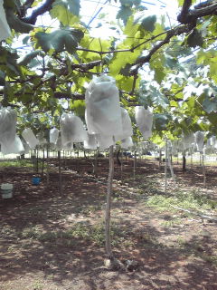 出不精の夫のお尻を叩き、今日は無事にぶどう狩りに行ってまいりました( ´ ▽ ` )ノ今日のメンバーは、夫、私、かえで、そしてヒマそうな桃も一緒に連れて行きました。母2004さんに教えていただいた、当県西部地方にある「マルワ農園」さんに向かいます。かえでには、「ぶどう狩りに行くよ」とは言ったけど、写真を見せても、未経験のことはよくわからなくて混乱するだけなので、着いてから実物を見せて、説明することにしました。「ぶどう、ぶどう?」と、車の中でも何度も聞いてきて、嬉しいんだか、イヤなのか、不安そうな雰囲気・・・高速を降りて、一般道を走っていると、どうも見覚えのある道…そういえば、この道はいつか来た道~♪ああ、そうだよ~お~…去年の9月に、かえでと林檎と私の3人で、鍾乳洞へ行ったときの道です!夫にそういうと、「今から竜ヶ岩洞(りゅうがしどう)行くか!その方が涼しくていいじゃん」と言い出し、桃も行ったことないから行きたいというので、ぶどう園は帰りに寄ることにして、先に竜ヶ岩洞に行くことになりました。かえでも、去年の記憶がしっかり残っているので、というか、一度経験したことはずっと忘れないので、とてもスムーズに見学できたのはよかったです(*´∇`*)車が多かったわりには、すごく空いていて、ゆっくり観ることもできたし、桃もなんだかすごく感動していて、一緒に連れて行った甲斐があったってもんです。洞窟から出て、お待ちかねのぶどう園に向かうことに♪ワンクッション置いたことで、かえでの不安も少し和らいだみたい^^竜ヶ岩洞から意外と近くて、すぐに到着しました。「こんにちは~… お友達からこちらでぶどう狩りをさせてもらえると聞いて来たんですけど」と言うと、ハウスの入り口にいたおねえさんが、にこやかに「こちらへどうぞ~」と案内してくれて、「昨日来てくれた方の紹介ですか?」と聞かれたのだけど、母2004さんの本名がわからないもんだから(^o^;)まさかHNを言うわけにもいかず(笑)あははは・・と笑ってごまかして、ハウスの奥に進みました^^わ~♪ハウスの中に、たくさんの袋が掛けられたぶどうが吊り下がってます♪ 「袋が掛かっていないのが採れますので、お好きなのをどうぞ♪」ということで、入園は無料で、採った分だけ量り売りしてもらうんだそうです。 いっぱい生ってますよ~!どれにしようか迷っちゃいます( ̄¬ ̄*)ジュル かえでに、「これなんか良さそうだから、ここを切ってね^^」とはさみを渡し・・・ ぱちん!上手に採れました♪では次どれにしようか、と移動しながら振り向くと、なんとかえでが、その近くにあったぶどうを切って採ってるじゃあ~りませんか( ̄□ ̄;)!!ちょっとあーた…どんどん勝手に採らないでちょーだいな(´□`。) 夫も桃もちょっとビックリ!でも、粒が揃った美味しそうな房で良かった(^o^;)結局、かえでが全部切って採って、ぶどう狩り独壇場でした。いい経験ができたと思います。これを夏休みの宿題のひとつ、絵日記に書かなくては!ってか、このブログをプリントして切って貼って出そうか( ̄▽ ̄;)(だって、これだって日記だし)量り売りと言っても、決して安いわけではないので、たくさん採りたいけど、お財布と相談してほどほどにしておきました。あと、一緒に梨も売っていたので、それも少し購入♪ とっても甘くて美味しいぶどうでした。あ、これは「ピオーネ」という品種ね(^_-)☆つい先日、ピオーネをスーパーで買って食べたんだけど、甘さが全然違いました。手塩に掛けて育てたぶどうというのが、よくわかる感じです。もちろんどこの農家でも、手塩に掛けているのは同じだと思いますが、何が違うんだろうね。林檎は小さい時、いつも「おかあさんといっしょ」を見ていて、その中で、大きくなったら○○ちゃんはね △△屋さんになるんだってさ決めた決めた△△屋さん もう絶対 決めた♪っていう歌(タイトル忘れた)があって、「林檎ちゃんはぶどうが大好きだから、大きくなったらぶどう屋さんになる~」なんて可愛く言っていて( ´艸`)きっと、甲府のほうへ嫁に行くのかも?と、冗談半分に言っていたことがあったけど、こんな近くにぶどう屋さんがあるから、大丈夫じゃん♪と、バイトから帰った林檎に言ってやりました( ̄▽ ̄;)ハッハッハ