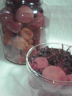 一昨日から干していた梅干し・・・ほんとは、明日の朝くらいまで干しておきたかったんだけど、先ほどから雨になってしまいまして・・・(´□`。)それでもなんとか三日ほどは干せたので、夕方に取り込んで、保存びんに詰めて、やっと完成です~~( ´ ▽ ` )ノ 数えたら、全部で72個ありました。詰める時に、一段ごと焼酎を吹いて殺菌しながら、ザラメをパラッと振ると、まろやかな酸味になるとかで、一応レシピどおりにやっておきました^^一粒お味見を・・・どれどれひょえ~~~っ!酸っぱーーーーいっ(>o<)梅干しだから酸っぱいのは当たり前だけど、粒が大きい分、酸っぱさもなかなかしっかり詰まってる感じでした(^o^;)でも、ヘンに加工された味ではなく、自然な色と酸っぱさです。昔ながらの・・って言葉でいいのかな?私が初めて作ったにしては、まあ上出来でしょ~( ̄▽ ̄;)カビなかっただけでもすごいと思って、また来年もやってみようと思います。しかし、こんなに酸っぱいと、食べるのに気合いがいります。もしかして、来年も残ってたりして・・・(+_+) ○●○●○●○●○●今月は、お盆休みの関係で、休みが不規則になっている夫です。この土日は出勤で、おまけに遅番なので、大河ドラマが見れないと言って、ブツブツ怒りながら行きました(笑)(ビデオの録画機能が壊れていて、録画できないの(^o^;)) ○●○●○●○●○●この2~3日は、のりピーの話題ばっかりのテレビですね。かえでの面倒を見ていると、テレビは見れないのだけど(どうせトトロと魔女宅だし・・)たまたま友達が電話をくれて、のりピーの話になって、なんかおかしな夫婦関係があらわになっただとか、のりピーの弟も某組員だとか、いろいろ教えてくれましたが・・・怖いですね~・・昔、高校の頃、スタ誕のオーディションに、友達と一緒にハガキを出したことがあって、友達にはオーディションの一次予選と会場の案内が来たんだけど、私には来なくて、すっごくショックだったことがあります(-_-;)友達は、見事に予選落ちしてきたので、内心「ざま~みろ」と思ったことは、今だから言えるのですけどね(笑)あの時、もし私が予選に行っていて、合格しちゃって、欽ちゃんが司会をしていたあの番組にも出て、また合格しちゃって、そしてデビューしちゃって、アイドルなんかになっちゃって、そして、もしかしたら自称プロサーファーと結婚してたりしたら、あんなふうな結末があったかもしれないと・・・わはは!ありえんら~( ´艸`)そう思うと、なんだかんだ言っても、今の生活って幸せなんだよなあと思いました♪ああ、私、芸能界に入ってなくて良かった~~( ̄▽ ̄;)