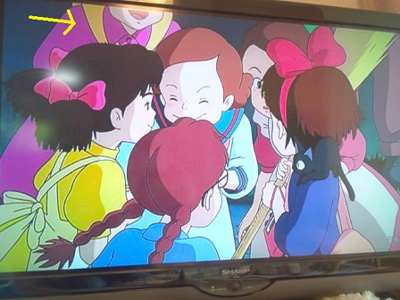 世間はゴールデンウィークですねえ。毎年のことですが、この時期の我が家のお出掛けは、もっぱら“茶園”です(笑)今日は、新茶をいただきました。美味しかったですぅ(*´▽`*)明日は、息子のショートステイが取れなかったので、お茶刈りができないもんだから、今日は、明日の分も刈ったりで、なかなか大変でした明日は第4日曜日、走ろう会へ行く予定だけど、体 痛いし(私が) 走れるかしら?(;´Д`) さて、そんな忙しい毎日ではありますが、かえでは、相変わらずマイペースで過ごしていて、てか、マイペースでないと崩れてしまうので、これでいいんですが、毎日、夕方に観る“魔女の宅急便”は、かえでの生活には、欠かせないものになっております。22にもなる男子が、魔女宅・・なんてオタクなんだろうね(笑)毎日付き合っている私も、さすがに飽きてはいるけど、このシーンになったら、夕飯の支度をしよう^^とか、このシーンをやってるから、あと10分で終わるな^^とか、そういう目安にもなったり(笑)そして、たまには違った見方をしてみようと、ちょっといろいろ検索してみたら、画家の女の子(ウルスラって名前)と、キキの声をやっている声優さんは、同じ人(高山みなみさん)だとか、パン屋のオソノさんは、元ヤンキー(笑)だったとか、最初に出てくるおまわりさんと、最後に出てくる実況アナウンサーは、山寺宏一さんが声をやっているとか・・まあ、面白い裏話みたいなのがたくさん♪ で、面白がって見てたら・・へんな都市伝説?を見つけてしまいました・・・( ̄_ ̄ i)最初の方の、キキが旅立つ時のシーン。キキ以外に、5人の少女がいるんですが、顔の上半分が映っていないピンクの服の子・・まったく動いてないんです(*_*;なんとなく、友達の輪の外にいるし、そんなことが不自然な感じなんだけど、次の場面になって、さらに驚くことが・・!あの、顔半分の動かない少女、いなくなってるんです!(o ̄∇ ̄)o!!ガーン↑ほら、キキ以外に4人しかいないでしょ?次のシーンでも、キキを見送るのは4人だけ・・↓ (||゚Д゚)ヒィィィ!なんか怖くない?いったい、あの少女は何者? ちょっと寒くなってきた・・