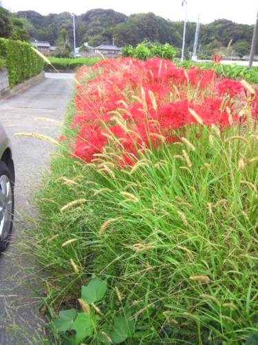 我が家に入る道の脇の草がボーボーで・・という日記を、しばらく前に書いたんですが、お隣の親戚の人が来ると、草刈りをしてくれるので、親戚の人、早く来ないかな・・と、待っていたんです。でも、あれから何度も見掛けるのに、畑に苗を植えたり、肥料や消毒をしたり、そういうのはやってるんだけど、一向に、草刈りをしてくれない・・(/_;)この草ボーボーなところには、毎年、彼岸花がたくさん咲くんです。少し前から、今年も咲き始めたんですが、草ボーボーな中に咲いていると、あんまりきれいに見えないってことがわかりました。ってことは、いつも、彼岸花が咲く前に、草刈りをしてくれて、きれいになったところに彼岸花が伸びてくる・・ということもわかりました。今はこんな感じ・・・↓車で通る時、彼岸花だけなら、そんなに邪魔にならないんです。ほかの雑草がはみ出してくるんです・・夫が、早く刈ってくれんかなあ・・と、毎日ぼやきながら、帰ってきます。でも、こちらから言えない。じゃあ、うちで刈ってしまおう・・と思っても、うちで刈ったのがわかると、嫌味に感じるんじゃないか?それか、申し訳なかったと気を遣わせるんじゃないか?そんなことを思うと、お隣さんが早く気づいてくれて、先に刈ってもらいたいわけです。 あと2週間ほどで、お祭りがあります。たぶん、その前にはきれいにしてくれると思うんですが、さすがにあと2週間も待てない。さあ、どうしよう(-_-;)いろいろ悩んだ挙句、刈ったのがわからないくらいな刈り方で、なおかつ、車で通る時に困らない程度に、雑草だけを刈ってしまおう。と、私の中で考えました。 おじいちゃんがいると、うるさく言われそうだったけど、今日から、お茶の秋冬番っていうのが始まって、お茶工場へ行くというので、今日は私ひとり♪今朝また、お隣の親戚の人が来ていたんですが、すぐに帰ってしまったので、よし、やるなら今日だ!ということで、お昼をまたいで2時間ほどかかりましたが、はみ出している部分だけを、刈っていきました。いい感じにできました\(^o^)/あとで、実際に車で通ってみたら、雑草も邪魔にならないし、草を刈ったこともわからない(o^-')bとりあえず、これでうちは困らなくなった。なんか、普通は草刈りやると、すっきりして気持ちいいはずなんだけど・・『刈りましたよ』って言っといた方がいいんだろうか?とか、何も言わなかったら、あとで気づいた時、何か言われないだろうか?とか、いろいろ先回りして考えすぎちゃって・・ちっともスッキリ感がなく、逆に、おどおどしちゃったりで、ヘンな後味の草刈りでした(;´Д`) 私は、蚊にいっぱい刺されるし、草でかぶれたのか、腕が痒くて、今日はこの秋一番の冷え込み?だったけど、昼間は暑くて汗だく刈った草は、うちの庭つづきの畑のすみに・・これを運ぶのが大変。ふー疲れました。 難しいですね。ご近所さんとの付き合い。うちとお隣さんは、昔からの、すごく古い付き合いなので、ちょっとしたことなら、お互いさま・・という感じですが、今回のように、こんなに草ボーボーで通る時に支障が出るのは初めて。そして、うちで草刈りをしたのも初めて。これが当たり前になっちゃうと困るなと思いつつも、何か良い方法を考えないとね(^_^;)今夜は、第九の練習日だけど、疲れたので、行くのやめようか・・考え中