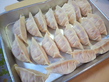 今夜は餃子です(いきなり(笑))てか、毎晩、何にしようかなあ・・って、ほんとに悩む。今日は、豚ひき肉が安かったので、餃子にしよ^^ってことになりました。いつも悩むのが、皮の枚数と、中味の具の量がちょうどよくなるか。ってこと。足りないと困ると思って、多めに作ると、具が余ってしまう。ちょうどよく作りたいので、餃子の皮の袋に書いてあるレシピ通りに、材料を揃えました。豚ひき肉180gキャベツ(または白菜)220gニラ50gニンニク・生姜 ひとかけあとは調味料いろいろキャベツはしっかり量りました。ニラはやめて、長ネギにしました。これも50g量ります。材料を混ぜ合わせて量ると、全部で480g。これを皮の枚数20枚で割ると、一個24g。で、皮一枚が7g。これに、24gの具をのせて、全部で31g。なんか細かい(笑)料理作ってる感じじゃないね(≧∇≦)しかし、ちょうどよい量のはずなのに、24gも包むのは、多すぎです。でも、余らせたくないので、たっぷりの具を、必死に包みました。皮をつまんでとじるのが大変でしたが、なんとか20個できました(^_^;)すごい太った餃子です。焼いてるうちに破れちゃうかな? よかった~破れずに焼けました( ´艸`)でも、一個が大きいので、食べ甲斐があるというか(笑)ほんとは、皮の薄い小ぶりの餃子を、ペロペロ食べる(ってどんな食べ方だよ(笑))のが好きなんだけど、たまにはいいか~~(^_^;) かえでは、皮のパリパリしたのを先に食べて、あとから中味を食べる人なんですが、中味を食べながら、「ハンバーグ」と言っていたのが爆笑でした あとねえ、またあさりの味噌汁。あさりちゃん、今日も気持ちよさげに、つのだせやりだせ♪ぴゅーっと水をとばしています。お湯が湧いて、さあ味噌汁にするぞー!と、殻を洗うために、ボールを持ったとたん、一斉に私に水を掛けてきました(@_@;)あさりの反撃こないだと同様、飼ってあげたいけど、エサは何がいいのかわかんないし・・ごめんよ~~というわけで、味噌汁、美味しかったです( ̄¬ ̄*)ごちそうさまでした(。-人-。)