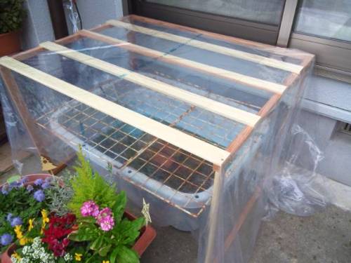 朝、洗濯物を干し終わって、玄関先で、花をいじっていたら・・なにか、チョロチョロっと動くものが!ドキッとして手をひっこめると、それは、小さなトカゲでした。見えるかな?真ん中あたりにいる小さいの。↓上の娘に画像を送ってあげようと思って、何枚も撮る!(笑)これは顔だけ、真ん中に見える↓クリックすると画像が大きくなるから、見てみてね~(って、見る人いないと思うが(笑))まあ、小さいからカワイイな~と思うわけで、あの娘が飼っていたデカイのは、私もとうとう触れなかった(^_^;) というわけで、今日はだいぶ調子もいいので、やりたいことを少しずつ・・爬虫類つながりで、下の娘が飼っていたカメさん。気温が下がってきたので、水中ヒーターを入れ始めたんですが、あんまりエサを食べないので、もっと温めてあげられないだろうか・・と、いろいろ考えているんです。しかも、屋根なしなので、雨が降ると、増水しちゃってヤバい。なので、屋根付きのおうちを作ってあげようかと(^_^;)カメなのに、贅沢であります。なんか、物言わぬ生き物って放っておけなくて。今日、カメの水槽・・というか、四角いタライみたいなやつなんですが、その寸法をはかって、屋根付きカメハウスの設計図を・・ これを持って、ホームセンターへ!で、この枠にする木を揃えて、これを組み立てるための釘と、屋根にするアクリル板と、全体を覆うビニールを購入。理想とするのは、こんな感じの園芸用のビニールハウス↓これをそのまま使えればいいんだけど、サイズが合わないので、自作するのです^^で、私ったら、この設計図を持っていながら、縦の木を買うのを忘れていた・・( ̄▽ ̄;) というわけで、今日は完成できなかったので、また続きは明日ね♪