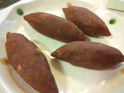 焼き芋を作りました。先日、息子が通所施設で芋掘りに行った時のサツマイモを使って♪ いい形のサツマイモですねえ。 こんがり美味しそうに焼けました~~♪ って、これ・・実はスィートポテトです。以前にも作ったことがあって、面白いし、美味しくできたのを思い出して、また挑戦してみました(^_^;)普通にスィートポテトの生地を作り、まわりの皮の分は、生地を少し取り分けて、それにココアと小麦粉を混ぜて、中味のお芋を包み、それらしい形に・・それを半分に切って、ゴマをつけて、オーブンで焼く(o^-')b おじいちゃんにあげたら、「こりゃあ皮をむくだか?」そして、「えらいもんを作ったなあ」と(≧∇≦)某クッ〇パッド参照なんですが、分量や作り方は私好みで。砂糖の代わりに、メープルシロップを使い、生クリームはちょっと多めに♪ペースト状にするのを、マッシャーでつぶしただけなので、お芋の雰囲気がそのまま出てるのが、いい感じになりました(*´▽`*) サツマイモとココア、そして、ちょこっとのゴマが、なんか絶妙に合うのです( ̄¬ ̄*)気になった方は、ぜひ作ってみてね~~************* さ~て今日は、ボジョレー・ヌーボー解禁ですね~夫が実家へ泊ってくると言っていたので、じゃ、今夜は私ひとりでこっそり飲んじゃお~~ということで、ハーフボトルを買ってきて、ワインに合いそうなおつまみ(1人分)を用意してたら、「今夜帰ります」ってメールが来ていた・・・( ̄_ ̄ i)