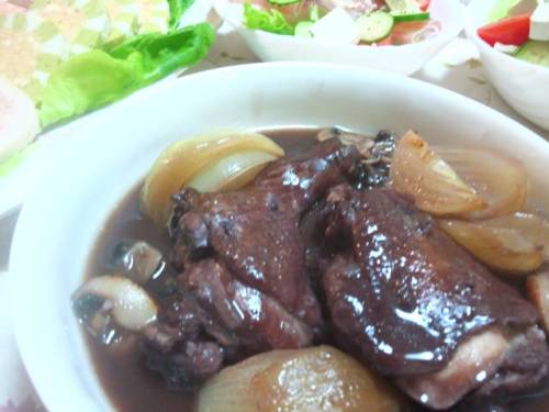 なんだか知らないけど、次々と用事が入って・・というか、用事はすぐに終わるんだけど、年賀状が進まないのですぅ~~(>_<)おかしい・・年賀状は、とっくに終わっている予定だったのに、なぜにまだ宛名書きをしているのだ?( ̄_ ̄ i)今夜は、おじいちゃんの年賀状を頑張らないと・・そして、明日の午後から用事ができちゃったので、徹夜してでも、明日の午前中に終わらせないと・・ というわけで、今日はクリスマス・イヴですね~今年は、娘もいないし、あんまりたくさんのお料理を作っても食べきれないし、作ってる時間もない(;´Д`)なので、とりあえず、クリスマスケーキと、お料理は、アダルトなおいしさ(笑)を求めて、コック・オ・バン・・という、チキンレッグを、赤ワインで煮込んだものを作りました。コック・オ・バン・・って、まるで、オバサンが料理してます^^みたいなネーミングですが(笑)コックは雄鶏、バンはワインの意味だとか(^_^;) なんか、色がイマイチだ(^_^;)あとは、生ハムとクリームチーズのサラダそして、出来あいのテリーヌ各種。と、手抜きメニュー。私は、煮込みに使ったワインの残り(笑)を飲んで、ああ、いい気分(*´▽`*)って、飲んだくれてる場合じゃないのだ。今から年賀状をやらねば((+_+)) あ、そうそう。私的にメインのクリスマスケーキ。秋にダンナ実家で栗拾いをしてきた時の栗・・茹でてくり抜いた実と、渋皮煮にしたものを冷凍しておいたので、それを使って、モンブランケーキを作りました(^_^;)スポンジはココア生地で。中にも、カットした渋皮煮の栗をたくさん入れました^^今日は、マロンクリームを作る時に、あんまり煮詰めすぎずにやわらかく仕上げたので、絞り出すのが楽にできてよかった(*´▽`*) というわけで、2日も日記を休んだら、どうかした?とメールもらったりで(^_^;)今日は、酔いざましに日記更新です(笑) メリークリスマス★素敵なクリスマスを・・(^-^)ノ~~
