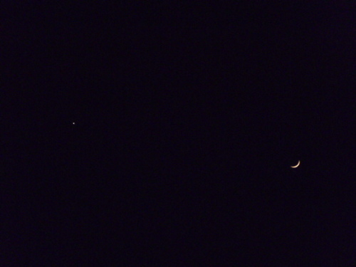 おとといと昨日の夕方、南西の空に、細くきれいな月と金星のランデブーが観られました^^一昨日(5日)の夕方遅い時間・・宵の明星は、とても明るく光っているので、ひと目でわかりますね~(画像の金星は小さいけど)右の方に、細い月が見えて、なんかいい感じな夜空に、うっとりしました。そして、昨日(6日)の夕方の南西の空。ちょっと早い時間(17時頃)に観てみました。前日より位置が変わっていますね。カメラを通すと、なんか小さくなっちゃって、残念ですが(^_^;)5日と6日がよく観える日だったので、両日とも観れてよかった♪精一杯 アップにすれば、ハッキリ見える^^ そして、昨日の夜は、第九の練習日で、暗くなってからの月が、これまたきれいでした。もっと下の方に移動していて、大きく赤く輝いていました。細い月も、あんなふうに観えるなんてね。不思議だなぁ・・これも観れてよかった~♪ *****************昨日は、日記をアップしたんだけど、またうまく反映されない現象(;´Д`)あれこれやってみてもダメなので、もうめんどくさくなって諦めました。 昨日は、お風呂掃除をがんばりました。お風呂は、もうすぐ取り壊しちゃうから、お掃除する必要もないか・・と思って、やらない予定だったけど、30年もお世話になったお風呂なので、最後はきれいにしてお別れを・・と思いまして(^_^;)きれいになりました。壊すのが勿体ないくらいですね(笑)でも、ボイラーも寿命だし、あちこちタイルもヒビが入ってるし、なんか漏電もしてるとかで、ギリギリな状態で使ってたんです・・ああ、来週からは、お風呂ジプシーな我が家( ̄▽ ̄;)*******************今日は、かえでのトランポリンでした。先月の大会以来、初めての練習日。今日は、技のこととかいろいろうるさく言われないせいか、みんなのびのびやっている感じが笑えました。大人の都合って、伝わるんだね( ´艸`)トランポリンの時の、かえでの精神安定剤は、頭にタオルを巻いて、その上に帽子をかぶっていることなんですが、ダウン症の女の子(息子より年上)が、いつも、「なんでタオルと帽子をかぶってるの?」と、聞いてきます。ここで帽子をかぶっているのが、彼女にとっては気に入らない・・というか、許せないらしいです。ここではかぶっていてはいけないと思っているようで、かえでの姿を見ては、イライラしている感じ・・その子のお母さんや、ほかのお母さんたちが、「かえでくんは、こうしていると落ち着くんだよ」と、いろいろ説明してくれるんですが、どうしても許せないようで、今日は、そばに来たと思ったら、いきなり帽子とタオルを取り上げてしまいました!(@_@;)今までのイライラが爆発したって感じでしょうか。かえでは、当然驚いて、声を出していました。「返してね」と言っても、「またかぶるから、返さない!」と怒っています。困っちゃいました。終わり頃だったので、お母さんがなだめて、帽子とタオルは返してもらえましたが、次からどうしようか・・何か策を講じなければ(>_<)かえでは、そんなにひどく荒れることもなく、普通に帰ってこれてホッとしましたが、私はちょっとブルーな気分で帰宅。 すると、いつものカマキリが、三つ指をついて、お出迎えしてくれました。おかえりなさいませ。おつかれさまでした。と言ってもらえたような(笑)