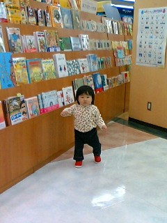 いつも行くビデオレンタルショップは、本屋と一緒の店舗なんですよね。昨日も飽きずに行ってきたんですけど、レンタルの後はいつも本屋でsum1ちゃんが絵本を読みます。最近はr1nも靴をはいてちょこちょこ歩くようになったので、お店の中でやりたい放題!5コマ写真でご覧下さいませ。「は~い、皆さん、ここは本がいっぱいありますね」「おりゃ!見て見て!」「あ、あっちにも本がいっぱいあるやん!」「よいしょっと・・どれどれ~?」「お!?・・今度はこっちや!忙しいわぁ!」こんな調子です・・。すいません。涙なくしては見れませんね・・。(といいつつ、写真とって楽しんでる・・?)この時は人がほとんどいなかったので、椅子もたくさん空いていたし、ちょっと好きなようにやらせてもらいましたが、本来はみんな椅子に座って、おりこうに絵本を楽しむコーナーなので、こんなことをする子は、ベビーカー縛り付けでございますね~。(降ろせ~~と、ギャオギャオとわめき倒すことは間違いないですが)家の中でも、テーブル用の高いベビーチェアーをあっという間に移動させて、棚の上にあるお菓子やらお菓子でないものやらを自由にGETするようになっちゃいました。(涙)そんなr1nちゃん、1歳と3ヶ月を迎えました。ここ最近、すごく言葉が増えたし、(ヨイショ!バナナ、ドーゾ、なんていう。)遊び方もすごく成長してます。。それにともなって、いたずら度合いもより激しく・・母は毎日クタクタです。