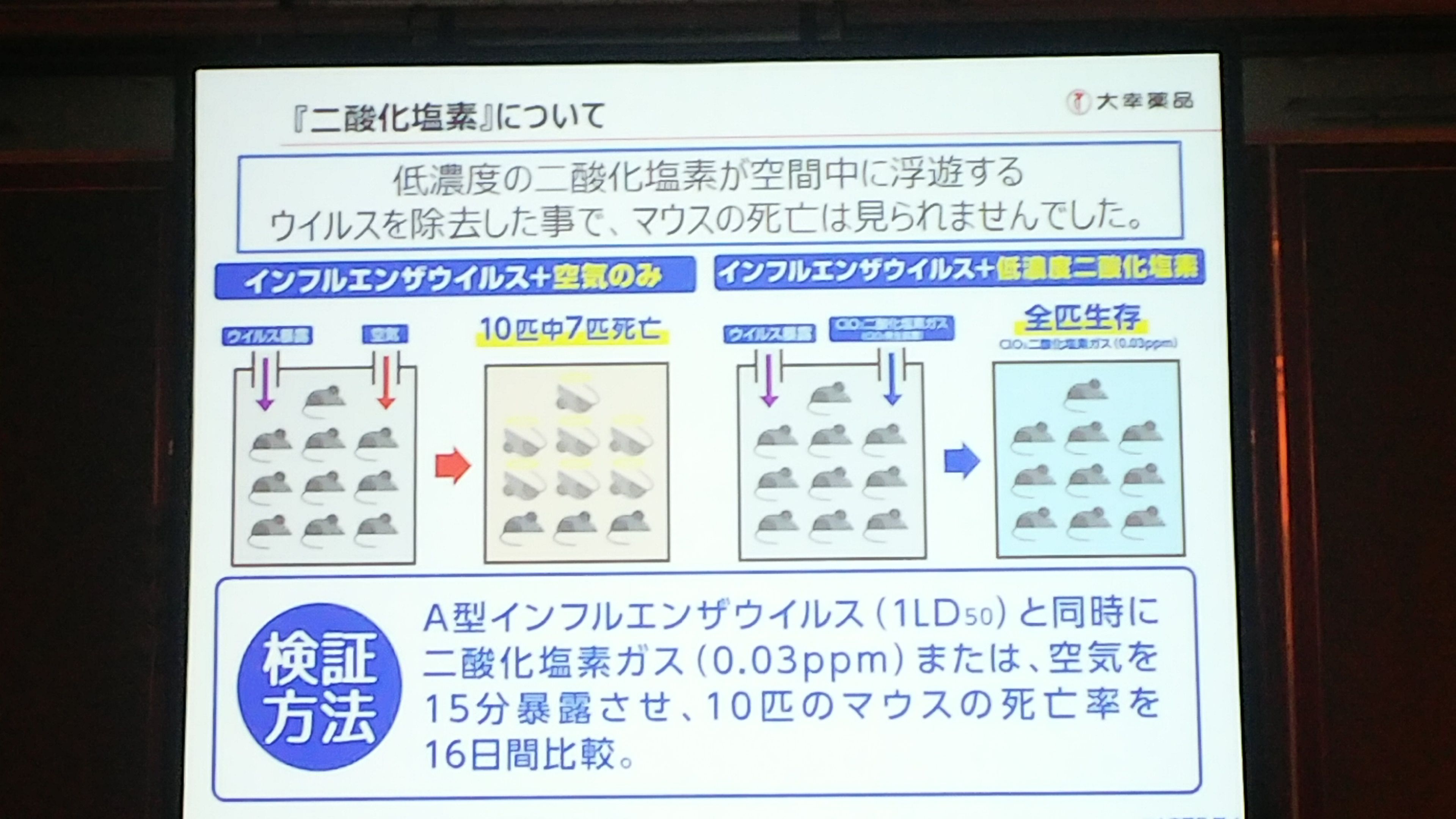 インフルエンザウィルスと低濃度二酸化塩素の部屋は、10匹生存という結果が出たそうです