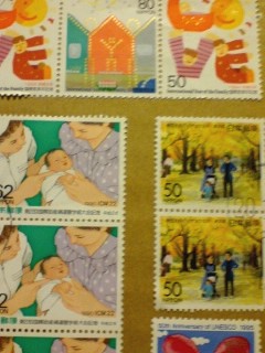 「うわ~これ見て!すごいよ。切手まで!」たまたま家に来ていた母が言いました。↑なんのことかと言いますと、友人が私に出産祝いを送ってくれたのです。受け取って、さっそくあけようとした私。でも、母の感嘆の声でその手を止めました。「ん?切手?」そうです。切手がこんな切手でした。すごくありませんか?赤ちゃんの切手や、イチョウ並木を歩く親子の切手・・・そのほか、ハートの切手など、幸せな切手が盛りだくさん。(最近の切手ではなく、1990年代のものもあります。)なんというか、ここまでお祝いの気持ちを込めてくれて、すっごくうれしかったです。・・・と同時に、「自分は他の誰かにこんなことしてあげたことないな」と思いました。でも、しようと思ってもなかなかできないのが、そういった気遣いではないでしょうか?たぶん、私は出来ないだろうな。ほかの事でカバーしていくしかないなぁ~などと、自己を見つめなおしました。贈り物もすっごく素敵なセレクト。その上、メッセージカードはユニセフのもので・・・私に対する贈り物なのに、世界にも貢献?している!私も、誰かに喜んでもらえる人になりたいな!そう思った贈り物でした。本当にありがとうございました。========☆==出産に際して、電話をくれた友人。メールをくれた友人。病院に来てくれた友人。そして、家に来てくれた友人。お祝いを送ってくれた友人。親戚、姉妹・・・そして両親。職場の仲間。本当にありがとうございました。(お礼が遅くてすいません。)生まれる前にエールをくれた方々。(お守り、ありがとうございました。)こんなにたくさんの神様が見守ってくれました。切手を見ていると、いろんなことに対してふつふつと感謝の念がわいてくるのでした。大切に飾っておこうっと。