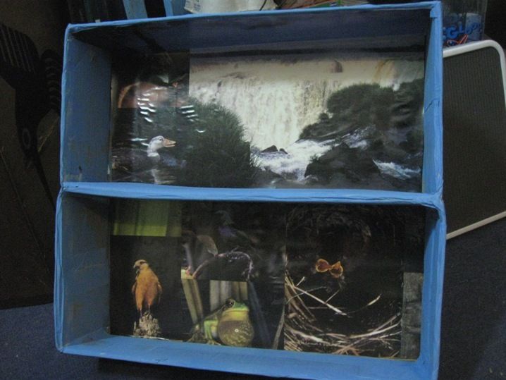 マリオに見せると食べ物と思ったようです。狙われてはイケナイと、彼のいかない場所、2階の雲行きベットの棚におさめました。そこでフト、棚も修理したくなりました。ダンボールを利用しているのですが、ペンキを塗って、中にエクアドルの使用していないポスターを貼って、窓から外をみているような感じに仕上げてみました。