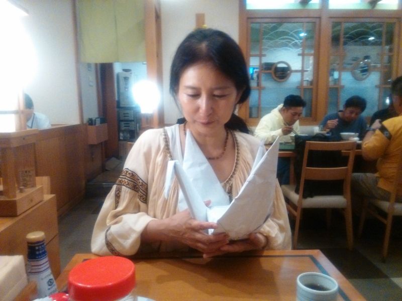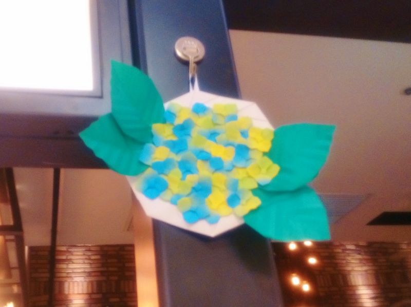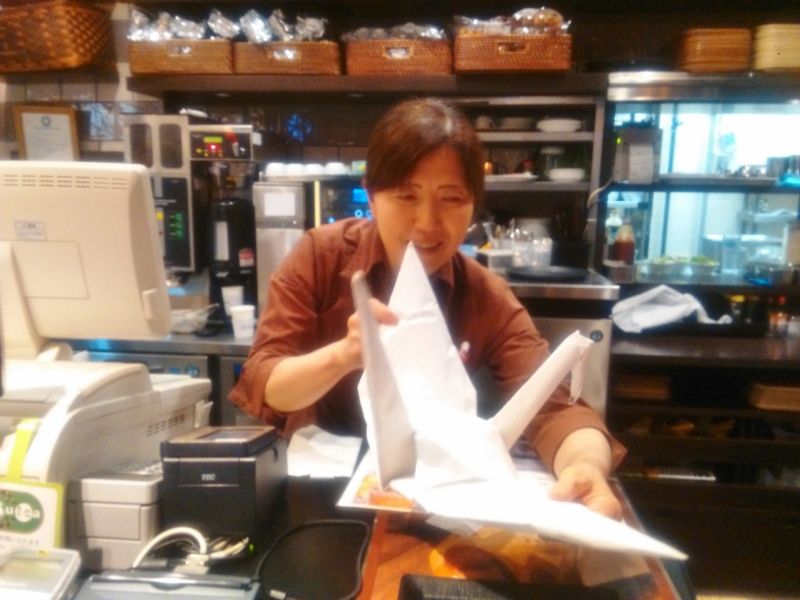 駆けつけてくれた翼友・竹中あこさん(つい先日、アイルランドツアーを終え帰国されたところ)と立ち寄った成田の喫茶店に孔雀のような「 ツル箱 」を発見。店員さん制作のもので・・店内には季節に合わせた折り紙を飾られています。この季節は「 あじさい 」でした。