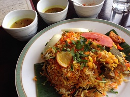 金曜日はビリヤニの日=「金ビリ」と言う事でお昼は銀座博品館6階のカーン ケバブ ビリヤニへ行ってビリヤニを食べて参りました♪こう言う糖質制限チートデイがデブの元である事は百も承知でございます ( ̄▽ ̄)♪ メニューを眺めていて吃驚です♪知らない名前のお料理がずらりと並んでいるではないですか ( ̄▽ ̄)♪Nihari =ラムの骨付き肉をコトコト煮込んだカレーPaya =インド、パキスタンで愛されている伝統料理。おもてなし料理Fish Head Curry =ベンガル地方の伝統魚料理(魚カレーを提供する店は少ないですから貴重です♪)Haleem =中東諸国や中央アジア、東南アジアで愛されている煮込み料理Lamb Uenchenna Mamsum =一口大のラム肉をココナッツミルクで煮込んだ南インドを代表する料理Lamb Kaleji in Mint =煮込み(ラムとミントの組み合わせは鉄板ですね♪)Lamb Coriander Gosht =ラム肉を煮込んだ伝統的なカレーどれもランチタイム価格@1,235円でのご提供です ( ̄ー ̄)ニヤリッこれは暫し通わなくっては!と思った親父でありますが、取り敢えず今日の目的はビリヤニですので、チキン・ラム・野菜と選べる中、ラムをお願い致しました♪ランチセットにはライタが付く事となっておりますが、食べログのマイレビュアーさん達がご指摘されている通り、サービス精神旺盛な当店、おまけでサンバル、ダールカレーの小鉢もついて参りました。サービス精神旺盛な支配人が名物化しておりますが(^^)私にはどなたか不明であったのは残念な事でありました。でもどのサービスの方も「辛さはどうだったか?」「味は期待通りだったか?」と心配そうに聞きに来てくれまして、なかなか良い感じでございます♪と言うビリヤニ!配膳されてそのカラフルな色合いに吃驚と言うか、大喜びでありまして、一瞬にしてテンションダダ上がりでございます♪オレンジに染色されたおコメが適宜配されておりまして、所謂デリー風ビリヤニと言う奴かと思われます(=最近仕入れた豆知識。違ってたらご免なさい ^^)。もう二人分じゃないかと思われる分量でありますが、バスマティ米の軽い食感、セット付属のアチャールやライタ、サービスのカレー等と混ぜ合わせながら頂きますと、食べ飽きると言う事も無く、なんと楽しく完食でございます♪ラム肉も骨付きでかなりの大きさで幾つも入ってます。骨から外すのがちょいと面倒なんですが、骨付きの方が美味しいんでしょうね♪ このままで全然構いませんです♪いやぁ~ビリヤニって楽しいお料理ですね♪ハレの日の料理と言う気分を実感したお昼時でありました。