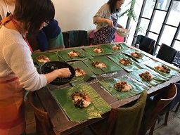 今日は11時からお料理教室でございます ( ̄ー ̄)ニヤリ参りましたのはお料理教室「kumbura」を主催されている古積由美子先生の白山のお店「yam-yam kade」でございます♪ お題はスリランカ料理 と言えば「これ!️」と言う感じの、バナナの葉で包まれたランプライス。お題の綴りは間違っておりませんで、ライスはお米のriceでは無いんです ( ̄ー ̄)ニヤリバナナの葉に包まれていれば全部ランプライスと思っちゃうど素人な訳ですが、何でもオランダ統治時代のオランダ人との混血文化の一つとの事でありまして、今でもダッチバーガーと呼ばれる人達がおられるそうな ( ̄▽ ̄)そんなこんなを教えて下さるのは、行きたかったけどなかなか都合が合わず行けていない「アハサ食堂」の美幸先生です♪先生のデモを見ながら色々お話を伺えて、とっても楽しい気付きの多いレッスンでした✨✨✨ 出来上がったお料理は皆んなで分担してバナナの葉に乗せ、各人がラップして完成です♪バナナの葉っぱって炙ると柔らかくなって落ち曲げる事が出来る様になるんです。そんな事も実際やってみないと分かりませんよね♪ 自分で包んで、速攻で開けちゃうと言う時間差に一同苦笑しながらバナナの葉を開くと、程よく「潰れた」ランプライスのビジュアルがもう最高です♪お味の方もバッチリ美味しくって、気付きも多かった、楽しくも美味しい週末のお昼時でした♪先生方、ご一緒頂いた皆さん、有難うございました♪
