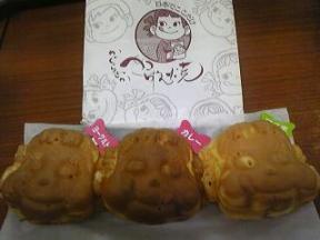 後輩がハローワークに行ったので、神楽坂のペコちゃん焼きを買って来てくれた。3種類の味を買ってきてくれたんだけど、焼き具合が違うのかな。かわの色がぜんぜん違う。ペコちゃんの目がこわ~っ。ヨーグルト・カレー・黒ごまどれもおいしかったです。