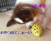 新しい知育玩具を買いました 中にスティックのおやつが5本入っています。 おもちゃをコロコロ転がしたり噛んだり、いろいろ試しているマロ。 今日は少しいじわるをして大きめのを入れてあるので、 1本取り出すのに結構時間がかかっています 1本だけどうしても出てこず、諦めちゃいました ちょっとスネてるマロ 諦めないでもうちょっと頑張ってみなよ あっ、そうですか(^^;)お疲れ様でしたぁ ☆おまけ☆ このおまけ、必要なかったですか?