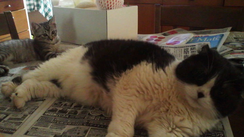 当初、チビ猫に近づいては威嚇され、すごすご後ずさりしていた気弱なオッサン猫マルハチ(オス、もうすぐ7才)でしたが、最近チビ猫(メス、名前未定)が慣れてきたので、ご覧の通り、2匹でまったり。