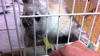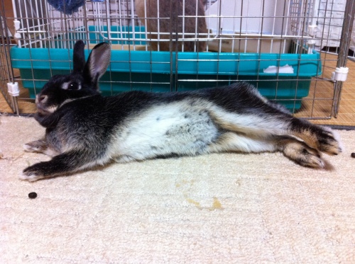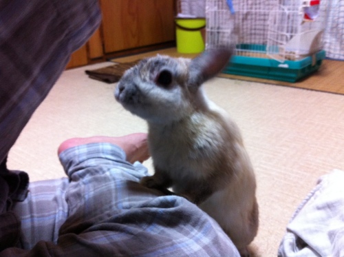 いつもどおりの日曜の朝。いつものように、くろちゃんにペレットをあげ、しろちゃんのケージを覆う布をめくったら、しろちゃんが、横たわり、足をジタバタしていた。手を差し伸べると、右に不安定な回転を始める。斜頚だ。今まで、いろんなウサギ飼いの人たちのブログを見ていたので、斜頚のうささんもたくさん見た。パスツレラかエンセファリトゾーンが脳、特に平衡感覚に重要な内耳を侵している。もともと、このどちらかに感染しているのは覚悟していたから、覚悟は出来ていたつもり、、、でも実際、目の前にすると、パニックしてしまう。しろちゃんも、自分の体に起きた状況にパニックしている。このままでは、あちこちぶつけて怪我をする。抱きかかえて、落ち着かせ、すぐに病院へ。原因は推測どおり。注射を二本と朝晩二回の薬をもらい帰宅。幸い、食欲が全く無いわけではなく、少しづつクチに持っていくと食べてくれる。注射が効いたのか、自分の足で立てるようになった。この場合、食欲が今後の状態を左右する。お昼までに、朝食分はクリアした。水も飲んでいる。後は、排泄。昼過ぎ、これもクリア。夕方、自力で水のみまで歩いている。傾きながら、少しづつ、自分の足で。ゆっくりでいいから、少しづつ。。。頑張れ、しろ!!絶対、治る!!