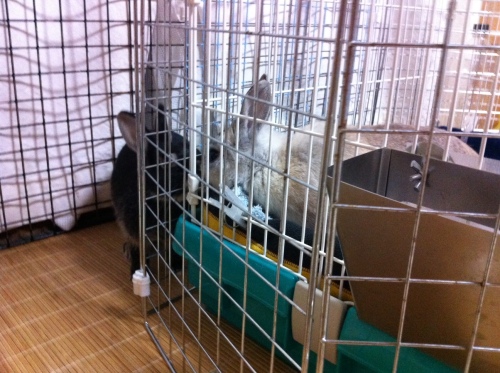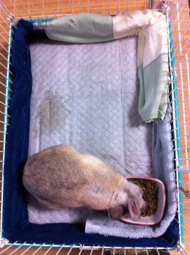 昨日の夜は、久々にくろちゃんを、部屋んぽさせました。しろちゃんのケージの周りに、もう一枚ネットを張って・・・。くろちゃん、いつもなら1日でも出さないと大暴れなのですが、少しだけ、空気を読んでいるようです。「しろちん、ダイジョウブ?」と何回か、挨拶にいくくろちん。さて、仕事から帰ってきたら、写真のように、とーちんが、タオルでケージをガードしてくれてました。体の自由が効かない、斜頚のウサギさんには、これ大事だそうです。よろけたり、ぶつかって、あちこちケガをするからです。牧草入れや、水入れの金具も普段ならなんでもないのですが、眼をついてしまう恐れがあるので、スポンジ状のもので覆ってくれていました。感謝、感謝・・・。今日の様子は、とーちんが昨日のブログにコメント入れてくれたので、そちらをご覧下さい。こんな時に、ルーターは壊れるしさて、食糞出来てないことが心配なので、ビタミンBをどこかで仕入れてきます。ではまた。