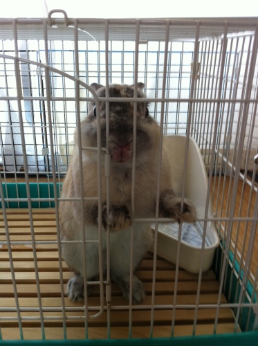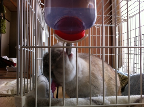 ケージにカバーを掛けて、私は眠りにつくのだけれど、時折の水を飲む、カラカラと言う音に、これほど安心した事は無い。たまに、ドタッと、多分転んでいるのだろうと思うけれど、それでもまた、カラカラと音が続く。いつもより、水の位置を低くしてあるけれど、どうしても、右へ首が戻ってしまうので、何度も何度も、ゆっくりと繰り返す。眼震は、ゆるやかになりつつあり、なんとなく、目も見えているようだ。朝、明るくなったらもう心配で眠れない。ドキドキしながら、カバーを取ると、チモシーをかじっていた。昨日は、チモシーには余り興味を示さなかったので、今日も少し進展。仕事に行っている間は、とーちゃんに様子を教えてもらおう。しろは、確実に頑張っている。
