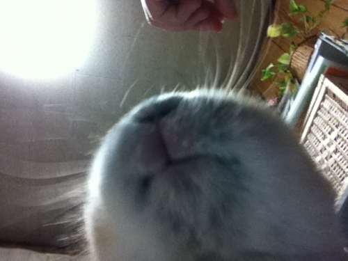 毎朝、毎晩、ケージの中のペットシーツを交換すとき、一旦しろちんを、キャリングケージに移すのですが、それが、とにかく、だいっきらい・・・・らしいです。抱えられるのが、怖い。たったかたったか、ケージ内を逃げ回り、やっと捕まえても、足をバタバタ、抱えさせてくれません。・・・・これは、その戦いの後。。。ま、でも、発症した最初は、バタバタすら出来なかったからね。愛おしきバタバタです。でも、あんまり暴れると、かーちん落っことしそうだから、覚悟を決めておくれ。しろさん。