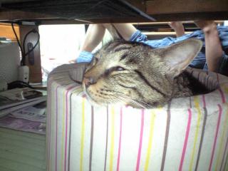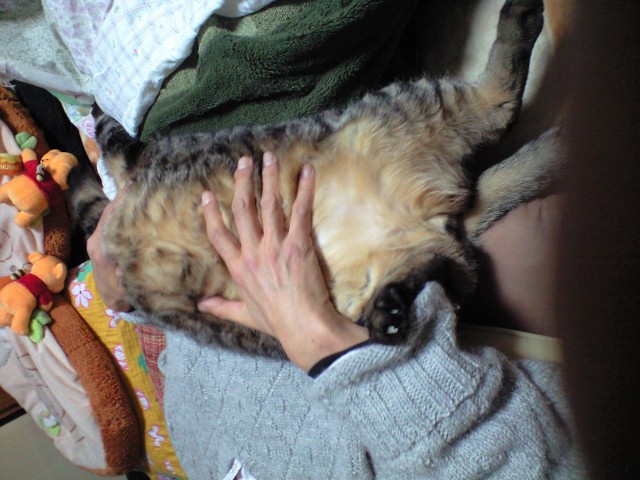 比較的何をされても動じないが、コミック本を乗せてもしばらくこのままでいる。。。重くないのか?嫌じゃないのか?顔は、また変なことしてると思われているような。。。まるのほうが大人です(ハハハハハ) またある日は、まるが面白い事をしていたりしまう、それは... 千両箱の箱を枕に(笑)大物です(ハイ)