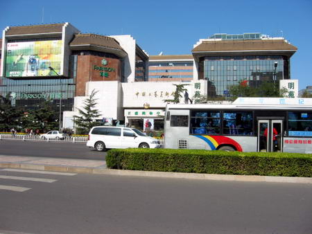 最初の二日間はバスのちょうど後ろにあるホテルに止まりました。空港で紹介してもらったら一泊300から400ユアンといわれて自分たちで探すほうが安いと思ったらなかなかみつからず結局ここは500ユアン、、、だいたい7000円くらいかな?払いました。バス停と地下鉄の駅がすぐ近くにあって大きな高級デパートがすぐ隣、お役所や天安門もすぐ近くということでホテルの場所がいいから高いということでした。