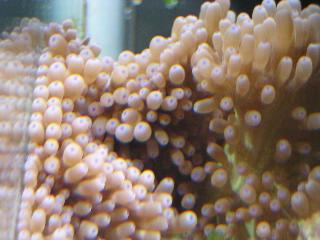 ★いつものように帰宅して水槽をみてみると、サンゴがみんな閉じてます(・-・)・・・ん~~~~???っていうか、溶けてるジャン (゜ロ゜;)エェッ!?水温を見てみると32℃、ヤバ~・・・、そういえば昨日給餌するときメインポンプ切ったんだ、 シマッタァ!、即行でスイッチオ~ン!!(メインポンプはクーラーと接続されてます)(ノ_-;)ハア…~ やってしまった、被害はミドリイシ系が2つ溶けました、それ以外はたぶん大丈夫でしょう、反省、すご~くヾ(_ _。)ハンセイ…せっかくシライトも調子が戻ったのに、先程の事故?により、縮んでおります、ホントごめんなさい(≧≦) ★最近、魚への給餌量が増えた為、水質が落ちてると思うんだけど(測ってないけど)今までと、違ったコケが生え始めましたね~、それと関係あるか、わかりませんがハナヤサイサンゴが内部から白化してきました、すごく調子良かったのにショックです、ハナヤサイには必ずといっていいほどカニが付いてきますが、コイツは原因じゃないと思う、他のミドリイシは何ともないのに。誰かアドバイスお願いします。m(__)m、そろそろ水換えしなきゃ!(;^。^A アセアセ・・追記(NO3測定しました、0~5mg/l かな?)
