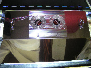★メタハラですが、一応ブルー球でいくつもりですが、その前に今週は6500Kを試してみました。まぁ前回にも書いた様に、まっ黄色な水槽ですが、ミドリイシ系は大丈夫ですね。成長したかどうかは、たった1週間では何とも言えませんが、一つのミドリイシだけは、ハッキリと成長が確認できました、残りは良く分かりません?ミドリイシの色ですが若干茶色っぽく、なったような気がしますが?照明の色のせいかも、意外と変化ナシかなぁ??・・・それから、ソフト系は、かなり嫌がってますね、メタハラが点灯すると縮んでしまいます。オオバナも岩陰に置いてありますが、グリーンから茶色になりましたね(~_~;)灯具が水面に接近している為、熱の問題がありますが、とくにメタハラの光は水中に入ってからも熱を持つので、サンゴが焼けるのを心配してましたが、平気みたいです。これからは、ブルー球に交換して、やっていきま~す。★メタハラに小細工してみました、当たり前ですが、灯具が熱く触ると火傷するので、ハードディスク用のファンを乗っけてみました。(子供が触る可能性大なので)(注)水温上昇抑制には、なんの効果もありませんので。点灯してても、リフレクター(灯具)は、なんとか触れます。あと灯具が吊り易いように、ステンの取っ手も付けました。こんな感じです↓、なかなかの出来!!( ̄▽ ̄)V