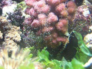 ★最近変な生物が増えてきて困ってます。そいつは透明ジェル状で1ミリ~5ミリくらいで、メタハラが消えると海藻などの先端に登ってきて、糸状の粘着質のものを10センチくらい出します(たぶん餌を取る為)、問題はその糸状のものがサンゴに付くと、サンゴがかなり嫌がってます、トサカなんかには巻きついてしまい弱ってしまいました、そいつを毎日ピンセットで摘まみ撤去してましたが、摘まみにくく潰してしまったりすると分裂しさらに増えていき、なかなか減りません、だれか経験のある方、いいアドバイスがあれば教えてください。★いままで立ち上げてからPHが8.2を超えることがなかったんですが、今日初めて8.23まで上がってきました(常時測定)思い当たることと言えば、2日前から自作リアクターを稼動させたことくらいです、サンゴが少ないのに稼動させるとPHが下がるかと思い止めてました、逆だったのか・・・まぁ良かったです。★それからコケはほとんど消滅してきましたが、こんどはワカメみたいのがガラス面に、いっぱい生えてきました、コケトリ貝も食べにくそうで、なかなかきれいに食べてくれませんが、おもしろそうなので、そのままにしておきます。味噌汁の具になるかも・・・(ワカメUPしました)★いままでやってましたブログは一応よく行くページの過去のブログにいれときました(非常に重いので危険です)