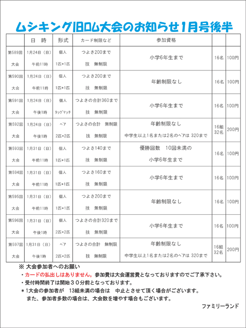 今日は日中は昨日に続いて暖かかったのですが夕方から北風が強くなって寒くなって来ました仕事の方は外回りが少なく社内業務が激務に殆ど会社から出られない状況でした夕方まで面付けやらデータ修正やらかかりましたが何とか定時過ぎに会社を出られて早めに帰宅早く帰ったけど夕食は一人でした夕食後、子供達は宿題昨日と違ってマーはダラダラやってました(爆)でもそんなに多くなかったので21時前には終了何故か二人とも早めに寝室へマサルナはまた一人リビングでテレビ見たりPC見たりしてます 今週の土曜日は出勤日なのでWHFも大会も行けませんが日曜日は浦和に行く予定です今週末の浦和の大会予定がアクシス商事のHPにアップされてないので先日浦和に行った時にもらったムシキング旧ロム大会情報をコピーしたので参加出来る方は参考にして下さい さぁ明日は金曜日土曜出勤でも頑張って定時で帰って夕食は晩酌しよう 最後に良かったらクリック宜しくお願いしますね