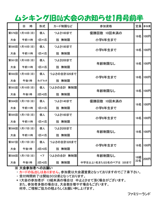 今日も毎週日曜日恒例のファミリーランド浦和店にムシキング旧ロム大会に行きました午前中のワンマッチはルナが頑張って決勝に行くものの…準優勝(;_;)午後は勝ち抜き2匹(無制限)とタッグマッチ320(小学生以下)と無制限ベアをやってくれましたが…勝ち抜き2匹戦はママが準優勝(;_;)ペア戦は子供達は初戦敗退(>_<)マサルナ&シンさんペアは頑張りましたが準決勝敗退(>_<)女性陣が準優勝2回で男性陣は準決勝敗退って感じです(^^ゞで、マーは?ちょっと低迷中ですさぁこれから新年会です!楽しみぃ~