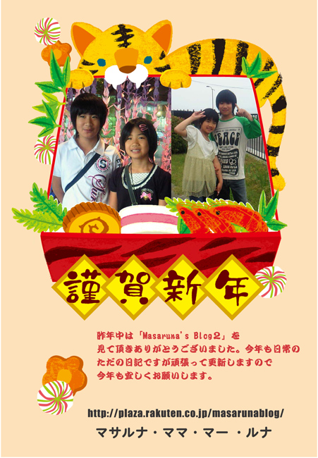 新年明けましておめでとうございます元旦の今日はとっても良い天気落ち着いた1年になればいいと思ってます今年マーは中学生にルナは5年生になります。楽しみですが成長に伴い親離れがちょっと寂しくなるかなぁ・・・でもマサルナもやりたい事があるのでそっちも出来たら嬉しいな マサルナ家ではこれから親戚が集まり新年会です昨年は呑み過ぎてしまい夕方に撃沈してしまったので今年は頑張って最後まで呑んでいたいなぁって思ってますが・・・無理かなぁ(爆)では皆様今年も良い年でありますよう祈っております拙いブログですがマサルナ家を今年も宜しくお願いします