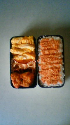玉子焼きとたらこスパゲッティと唐揚げ(^_-)