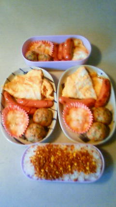 玉子焼きとウィンナーとカップグラタンとひじき揚げって感じです。