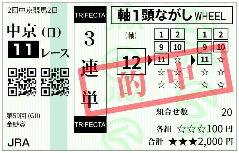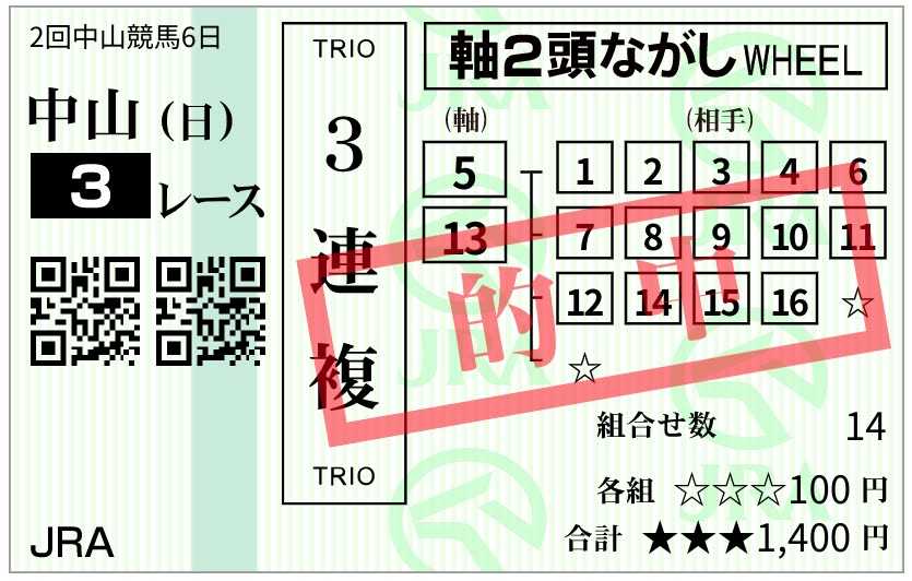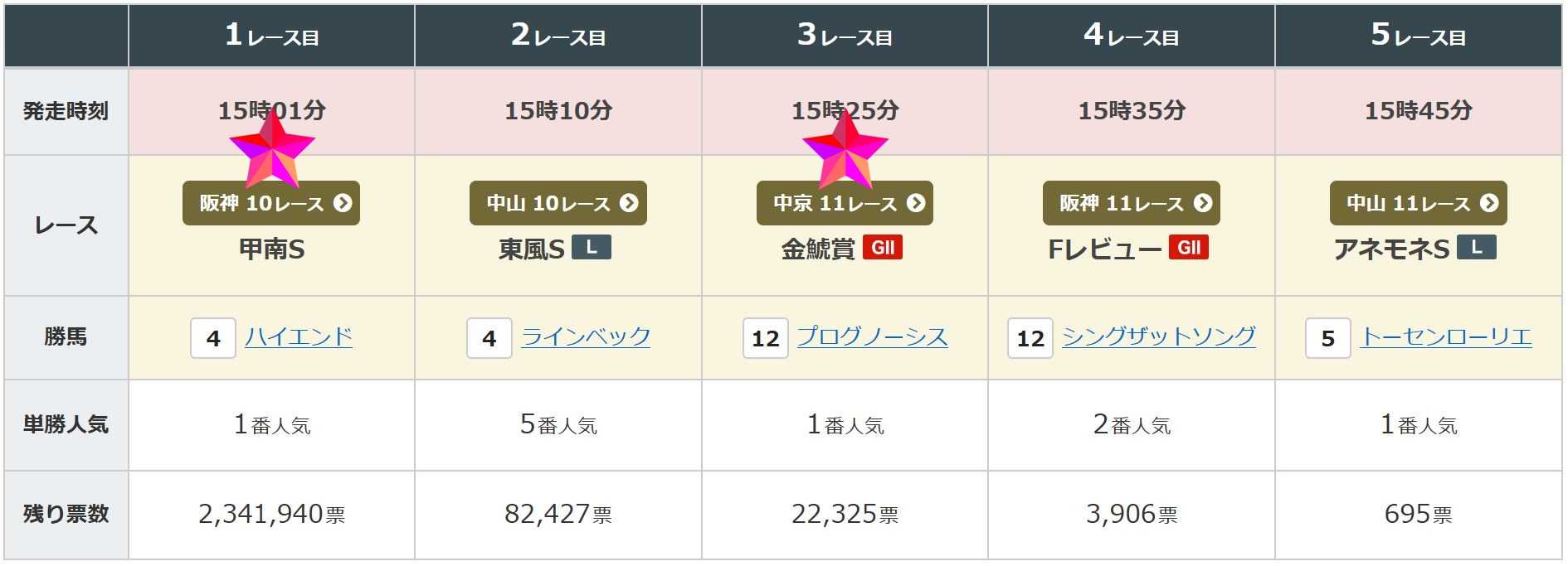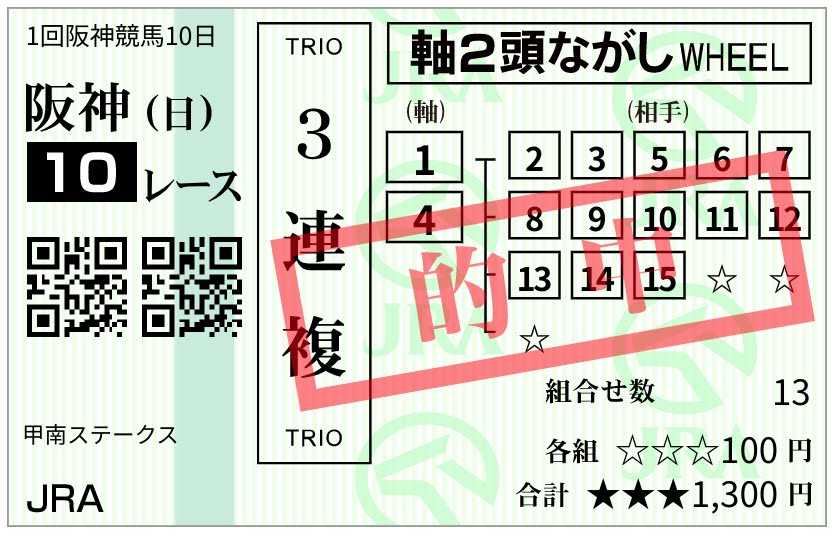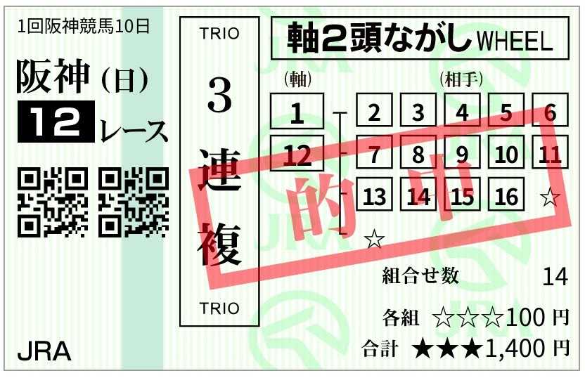 | 通番 | 阪神 10R | 中山 10R | 中京 11R | 阪神 11R | 中山 11R | 購入金額 | 払戻単価 | 払戻/返還金額 |