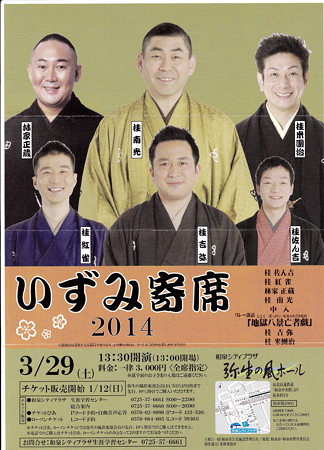 (本日更新1)今日は午後から、楽しみにしていた「いずみ寄席」を楽しんできました。和泉シティプラザ「弥生の風ホール」の前から9列目のど真ん中のチケットを確保できたので、ほぼかぶりつきで桂米團治・桂南光・桂吉弥等の豪華な桂一門と関東から林家正蔵の落語を聞き、思いっきり大笑いして来ました(^o^ゞ★いずみ寄席2014ちらしいずみ寄席 ☆posted by 手持ちのまっちゃん