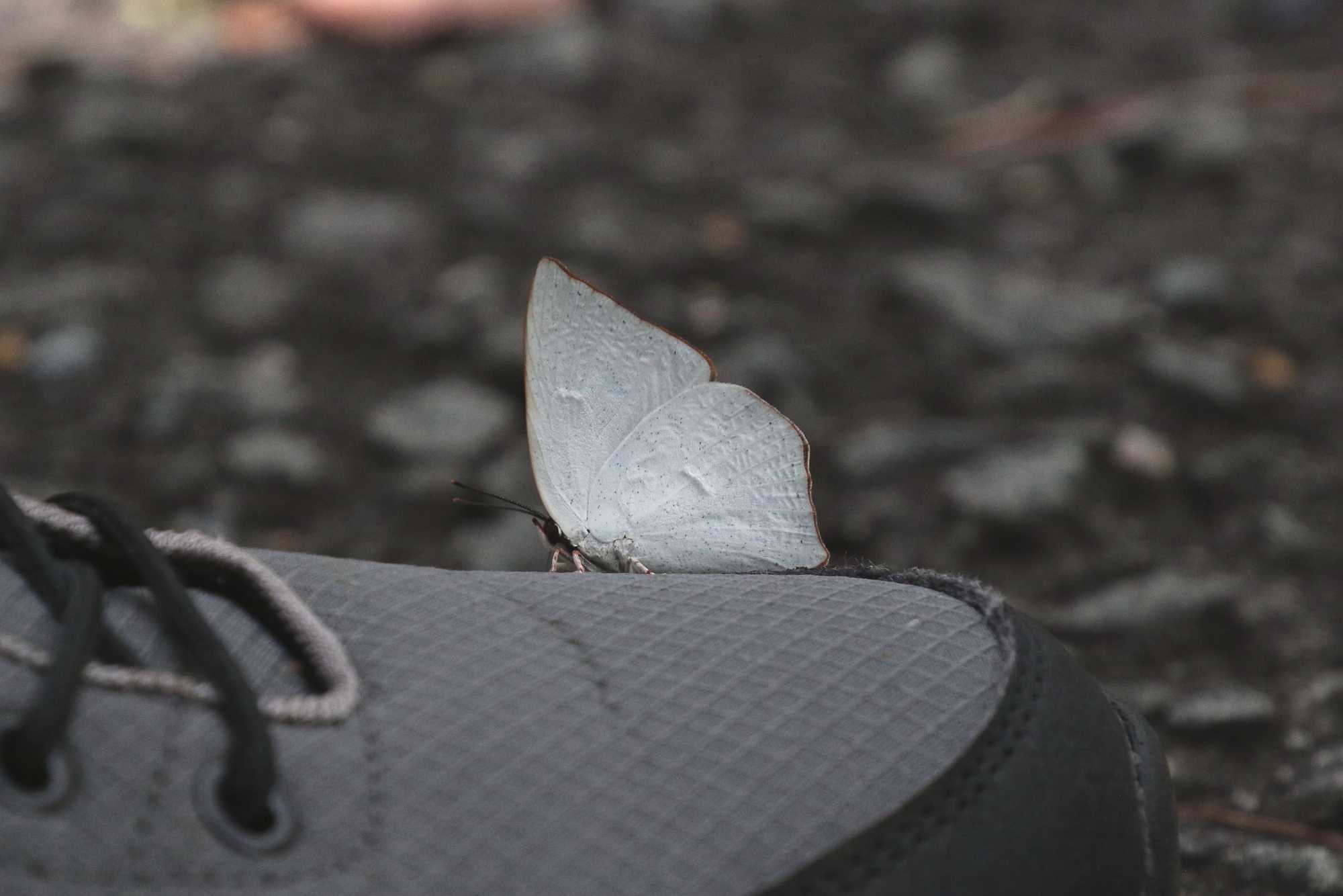 岩湧の森で、管理棟に迷い込んだ「ウラギンシジミ」が、窓から出られずにいたので、このままでは死んでしまうと思い、何とか誘導して戸外に出してやると、喜んで靴に留ってサービスしてくれました(^-^)