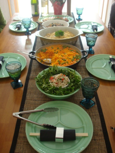 お友達家族を招いてディナーをしました。料理を作るのは大好きですそれが美味しいか、不味いかは別にして…笑。今回はチャイニーズ料理に挑戦。といっても至って簡単なメニューを選択。セロリ、ニンジンのごま油ポン酢ドレッシングがけ。ピータンの香草和え。ピリ辛エビチリ。巻き寿司。飲茶。私が大好きなシュウマイと、湯葉巻きは最高お友達が作ったバレンタイン仕様のジェリー。白と赤の層が何段も出来、手のこんだ美味しいデザート。そして、柔らかいクレープ生地に、甘くて美味しいカスタードを巻いた物。奥様が作って、ご主人が巻いたそうです。子供同士も楽しく遊び、夫婦同氏、大笑いして楽しい時間でした