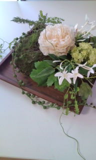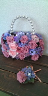 今年も母の日が終わりホッとしているところです。 母の日のお花屋さんはさすがに忙しいです(^-^)でも、アレンジメントや花束作り、色合わせがやっぱり楽しい。 さて今週末、友人の結婚式に出席します。 ブーケを作らせてもらいました。当日が楽しみですo(^o^)o 年下の旦那様とは7年お付き合いしてのゴールインとなりました。ジャニーズファン歴およそ20年の彼女。 足繁くコンサートだ舞台だと通っている筋金入りのファンなわけですが、旦那様には内緒なんだとか(笑)。披露宴の翌週もコンサートなんだそうです。 ポスターや雑誌、CDなど数々のコレクションは実家の部屋のクローゼットとロフトを埋め尽くしています。なんと言っても20年分です。半端な数じゃありません(??????@) ファンクラブには住所変更の届けは出さず、郵便物は実家に取りに帰るんだとか。 彼が本当に知らないのか、知らない振りをしているのかは謎ですが、まぁ、なるようになるのでしょう(笑)。 連休中、この友人のアーティフィシャルフラワーのブーケを作る前に、もう一つプリザーブドフラワーのブーケをつくりました。 こちらはコンテストに出品するため、画像は載せられないのですが、久しぶりに何日か夜なべ仕事しました(+_+)本当は以前から考えていた形は、ブーケではなくアレンジメントでした。 でも作ってみるとなんだかピンと来なくて、かといって適当な物も作れません。 もう、締め切りも迫っているし、 今回はあきらめることにしました。 でも、何日もずっとモヤモヤして、頭の隅っこではいつもデザインを考えていました。 「ラグジュアリーな時間」 これが今回のコンテストのテーマです。 私、ブーケでだったら、表現出来る…。 と、思ってしまったので(笑)頑張りました。 去年と同じ一年を過ごさないために 頑張ってみました。 さて、写真による第一次審査は通過できるでしょうか…。 良い結果が出たら!(笑)ここで報告させていただきます☆ ピンクのバラのラウンドブーケは、今月のレッスンで作ってます(^-^)v