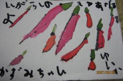 昨日の基礎代謝がよいということで『太りにくい体質』を自慢して歩いていましたが、その太りにくい体質を圧してここまで太るには並々ならぬ努力があったわけでして。 そもそもわたしが太り始めたのは、教育委員会に非常勤で勤め始めたころからでした。そのころのわたしの体重は48キロでした。 教育委員会は非常に静かな職場でした。ページをめくる音、キーボードを打つ音、コーヒーがボコボコと沸く音、わたしの腕時計の秒針がチクチクと動く音まで聞こえました。 その静寂を破るようにわたしの腹の虫がぐううううう。 そこで! 朝食を2度食べていくことにしたのです。6時15分におっちゃんと一緒にパンとコーヒー、8時半にごはんを詰め込んで出勤するようにしました。おかげで腹の虫は泣かなくなりました。当然、体重はぐんぐん増えていきました。 体重は50キロを超えると40キロ台には戻れません。55キロを超えると後は増える一方です。高血圧のこともあり、お医者からは56キロが限度ですよと釘を刺されていましたが、先週の土曜日にはとうとう大台に乗ってしまいました。 太り始めたのが平成10年の梅雨のころでしたからちょうど9年。長いなあ! ちょっとやそっとでは体重は落ちないね。長期戦でいきますか! 久しぶりに絵手紙を描きました。私のそばでゆいかも描きました。『とんがらしのえを あげるよ』『ぷちとまと』『みずたまもようのいぬと ねこ』 ゲージュツの秋です。 応援ポチお願いします! 人気blogランキングへ