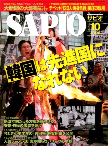 韓国は先進国になれない同じ目線で見るから腹も立つまだまだ未開の国なのだSAPIO 10月号【送料無料】 ¥680(税込)〔総力特集 ヘッドライン〕■ スポーツ 世界の顰蹙を省みず、国ぐるみでスポーツを政治化する「痛々しい国」/鄭大均■ 司法 「元徴用工に賠償しろ」「仏像は日本に返還するな」 法も条約も無視する法治なき野蛮社会/本誌編集部■ 緊急寄稿 サピオに寄稿した直後、私は入国拒否された 都合の悪い言論、人物を消し去る国に未来はない/呉善花■ メディア 大手マスコミが扇動する「反日無罪」の安倍叩きは異論を一切認めない/黒田勝弘■ 技術力 沈む高速道路、流れる堤防、落ちる橋──見るも無惨なウリジナルインフラ/本誌編集部■ 歴史 「お金」も「学校」もなく街は糞尿だらけ──日本併合前の朝鮮は“原始の国”だった/水間政憲■ 性差別 「韓流ドラマ」はうたかたの夢 結婚・就職後に待ち受ける「超」男尊女卑社会/張赫■ 傾向 「一緒に井戸を掘り、一人で飲む」──諺でわかる韓国人の国民性/室谷克実■ 差別 おぞましいヘイトスピーチを繰り返せば世界は日本を韓国と同じ「民度の低い国」と見なす/本誌編集部■ 慰安婦 「創作された」慰安婦の実態を明らかにする 日本は現地住民女性を守った!/金完燮