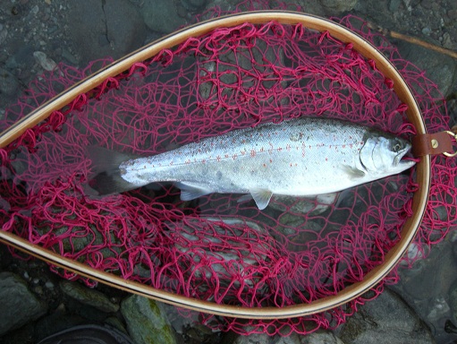 15:00~18:00 仁淀川中流域先日は2連続でサツキマスを掛けることができないという醜態を晒してしまったので今日こそはサツキ釣るぞと気合いれて3時間釣行!最初はマイホームのポイントに。チェイスすらなしそろそろ流れの速いポイントでつれてもおかしくないシーズンのはずなのに・・・上流のテトラポイントへ移動OH対岸に2人のアングラーがまたまた移動道の駅前でやってやろうと思ってましたが、ここでもアングラーが、移動!サツキを狙う最上流部の黒瀬に来ましたここには、海から遡上してくるやつは、まだ居ないだろうなぁ瀬がらみのポイントを攻めます3投目にゴンぐりぐりぐりシルバーの魚体が見える引きからして25-30クラスの残留サツキだ3回目のチャンスを物にできたぜ。三度目の正直だ。ヒャッホウやっとネットに入れて撮影できるそいしてその時は訪れた・・・・・・・・・・・・フッいやああああああああああああああああああん思わず「うっわ!マジかよ!」って大きな声が出てしまった(笑初物であせって強引に寄せようとしたのが失敗だったさすがに3連続は心が折れかけるパトラッシュ僕もう疲れたよ・・・・・