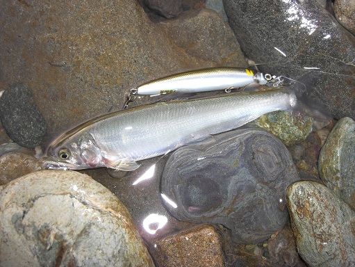 17:30~19:00 仁淀川中流域今日は仁淀川の中流域にサツキ狙いへ瀬をミルドレッドで流していると稚鮎がつれました。いよいよ中流域も本格化してきたようですさてさて、時刻は18:00と一番つれる時間帯になりまして本流筋をリッジ70Sのゴースト鮎カラーを気合を入れてダードさせていると、ゴンッと当たりつかさず合わせるも掛からない・・・・・・・・・・・なんでや明らかなサツキの当り×2回、サツキマスバラシ×1回、多分ウグイの当り×2回ミスってますがな気のせいだ気のせい、全部底の石に当ったんだ。俺みたいな奴のルアーに引っかかる魚なんて居なかったんだ。なんだ・・よかった今までこんな事なかったのに・・・ロッドの相性かなぁでも今年は色々買って金ないから来年買い換えるか誰か俺のロッドとソウルズのロッド交換してください(笑