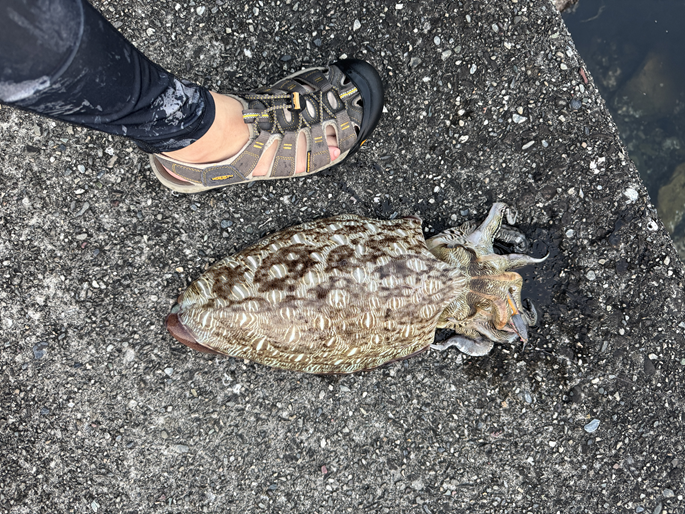 18:00-19:30 中部漁港本日友人と夕マズメに湾内にタコ釣りへでポイントに着いてエギを投げえるもタコ釣れずほんと日暮れ間際に時合いが来たみたいで、イカやタコが釣れだすで対岸の堤防で釣ってた友人がデカいぞいうので見に行ったらナイスモンゴウイカクソ美味そうで羨ましいコウイカポイントも見つけて、また近場での釣りもの増えたなぁ個人的にはアオリよりコウイカ釣りたいので、コウイカ用のスッテとか買ってたがコウイカスッテ投げたらタコつれて、タコエギ投げたらコウイカ釣れるどっちも底周辺なので、タックル選択まようんですよねぇまぁ、コウイカはPE3号直結でも釣れましたがあ、タコの釣果は2杯でした
