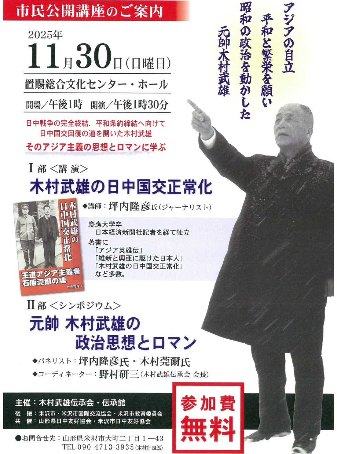 木村武雄伝承会「市民公開講座」を11月30日(日)に行います。午後1時開場、1時30分開演…