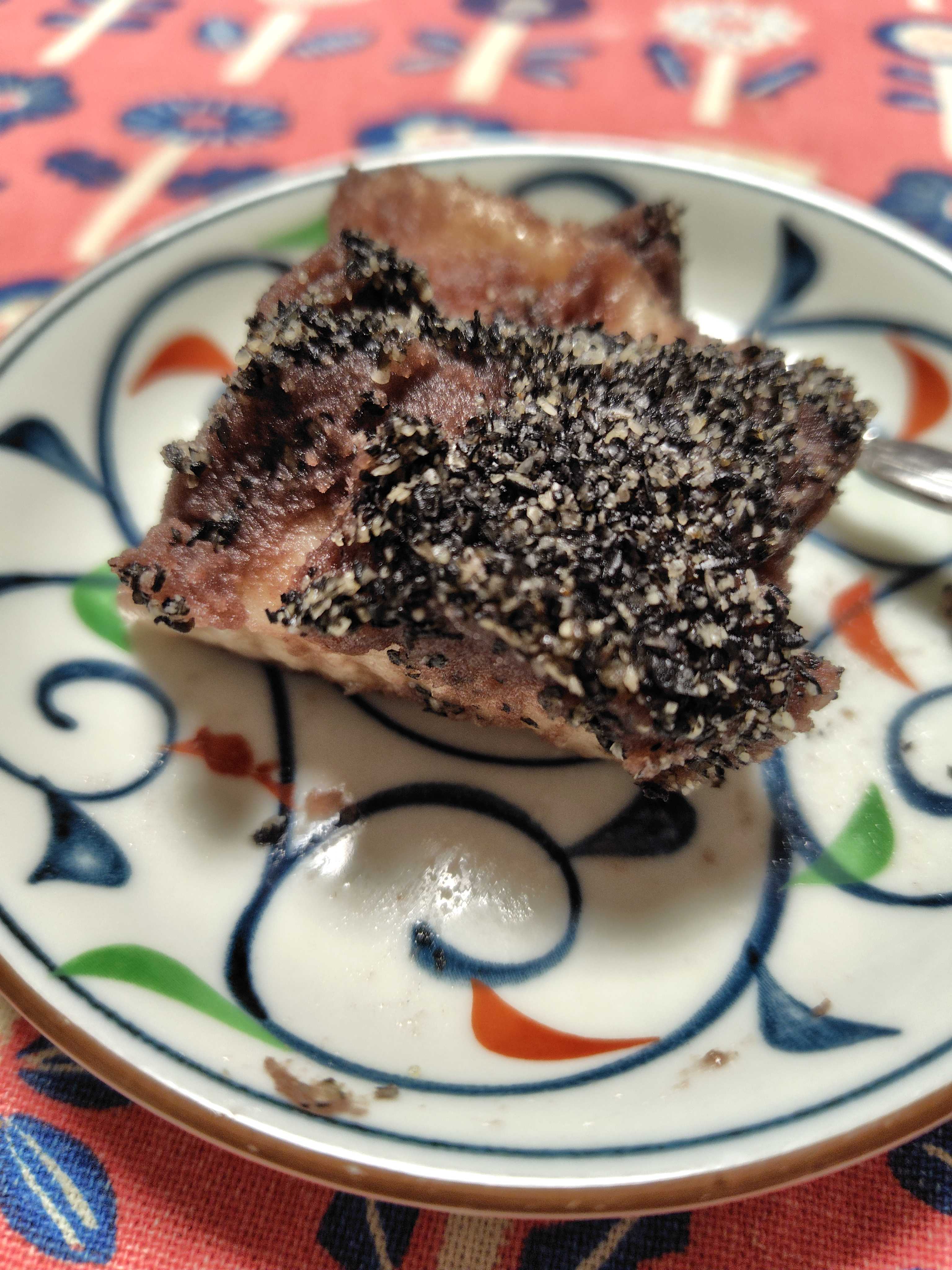 びっしりあんこと胡麻が載っているお餅はふんわりと柔らかいです。