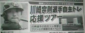 家に帰って新聞を見ていたら、ある広告欄に目が留まったのだが、なんかよくよく考えてみると面白くてつぼにはまってしまったーー(^^)そもそもスポーツ選手の「自主トレ」って人目を忍んで、黙々とやるのが普通じゃないのか?ファンがただ見学するのは50歩譲るにしてもなぜかホテルでのトークイベント・ビンゴゲーム・記念写真撮影・・なぜかヨン様を追っかけるおばさん達のイメージが浮かんだのだが、、、川崎よ、こんな話に乗って、来季の活躍は大丈夫か?