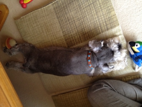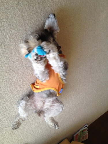 結構暑いのに、まだエアコンをいれてもらえないはなちゃん。伸びてます!いつもは背中を3mmのバリカンで刈られているのですが、暑いので1mmに。さわり心地サイコーです!